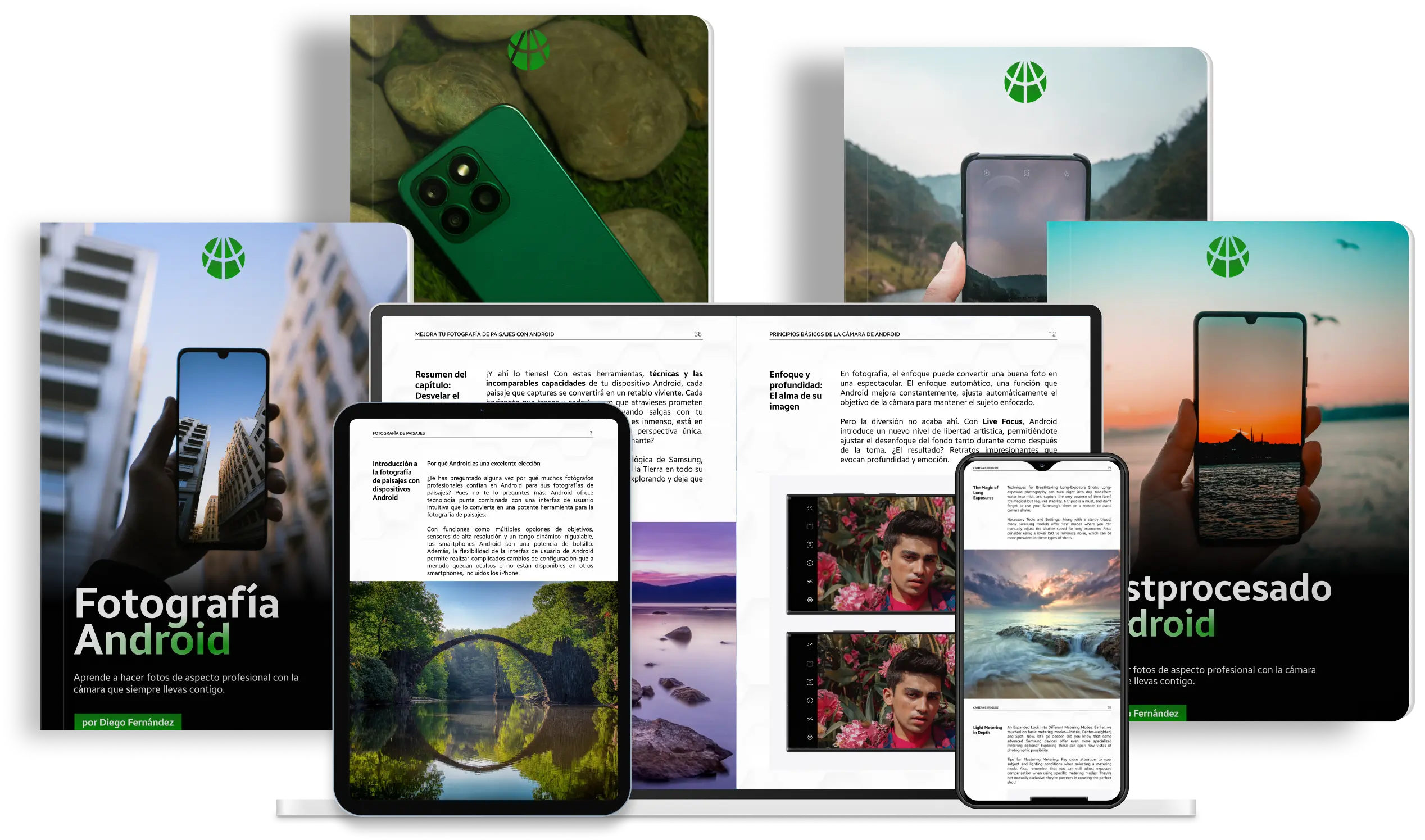 Actualmente ofrecemos seis libros: Fotografía Android, Fotografía de Paisajes, Ajustes Android, Postprocesado Android, fotografía móvil con inteligencia artificial y Fotografía de Alimentos. Cada libro se centra en un tema específico y abarca desde la composición y la iluminación hasta las técnicas de posprocesamiento y edición.